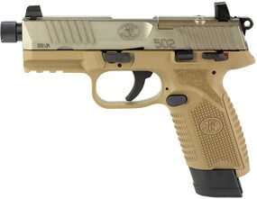 FN America 502 Tactical Single Action Only Polymer Frame Compact 22 LR 4.6″ Threaded Barrel, 1/2X28 Thread Pitch, Flat Dark Earth, Fixed Suppressor Height Sights, Ambidextrous Thumb Safety, No Decocker, Optics Ready Slide, 2 Magazines, (1)-10 Round and (1)-15 Round