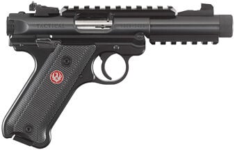 Ruger Mark IV Tactical Metal Frame Full Size 22LR 4.4″ Threaded Barrel, Alloy, Blued Finish, Checkered Grips, Adjustable Rear Sight, 10 Rounds, 2 Magazines, Picatinny Rails on Top and Bottom of Barrel