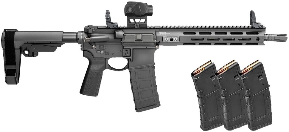 Springfield SAINT Victor V2 AR Pistol 223 Remington/5.56 NATO, 11.5″ Barrel, Anodized Black Finish, B5 Systems Type 23 Grip, SBA3 Pistol Stabilizing Brace, Includes Front and Rear Flip Up Sights, Ambidextrous Safety, Free Float M-LOK Handguard, Sling Mounting Points, Taper-pinned Gas Block, Includes Viridian Venta Green Dot Optic and 4 Magazines