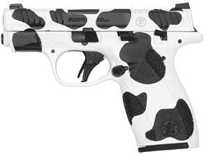 Smith & Wesson Bodyguard 2.0 Striker Fired Polymer Frame Micro-Compact 380 ACP 2.75″ Barrel, Cerakote Finish, Custom Cow Print by Skydas, Bright Dot Front Sight with Tritium Insert, U-Notch Rear Sight, Flat Face Trigger, Manual Thumb Safety, 2 Magazines, (1)-12 Round and (1)-10 Round