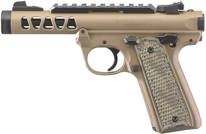 Ruger Mark IV 22/45 Lite 22 LR 4.4″ Threaded Barrel, 1/2×28, Flat Dark Earth Cerakote Finish, G10 Grips, Optic Ready, Ambidextrous Safety, 10 Rounds, 2 Magazines