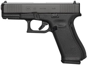 GLOCK 45 Compact 9MM 4.02″ Barrel, Glock Marksman Barrel, Black nDLC Finish, No Finger Grooves, Fixed Sights, Front Serrations, Ambidextrous Slide Stop Lever, Flared Mag Well, 17 Rounds, 3 Magazines