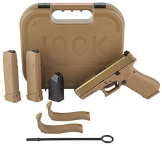 GLOCK 19X V Series Striker Fired Polymer Frame Compact 9MM 4.02″ Barrel, Glock Marksman Barrel, nPVD Coyote Finish, No Finger Grooves, Glock Night Sights, Ambidextrous Slide Stop Lever, 3 Magazines, (2)-19 Round Magazines, (1)-17 Round Magazine, Coyote Colored Pistol Case