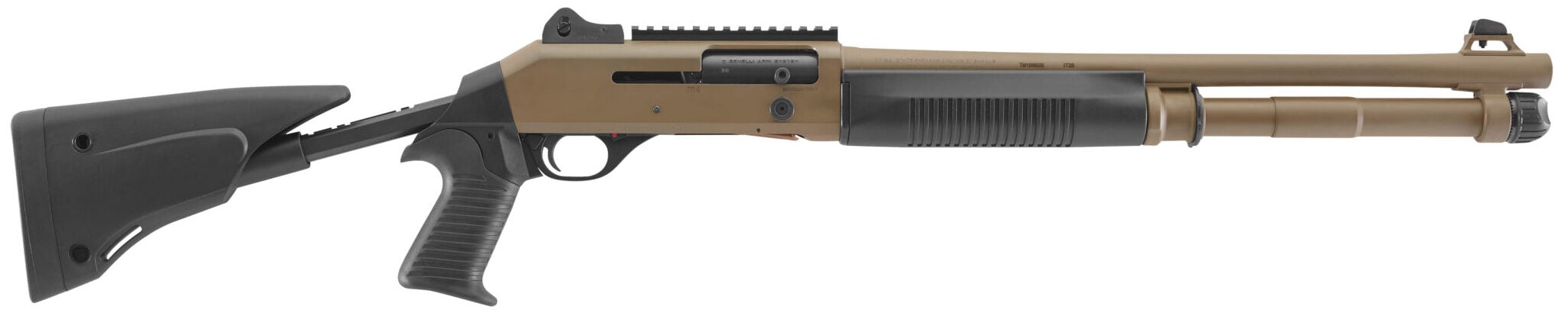 Benelli M4 Tactical 12 Gauge 18.5″ Barrel, 3″ Chamber, 7+1 Capacity, 5 Position Adjustable Stock, Flat Dark Earth Cerakote Finish, Cylinder Choke, Picatinny Rail, Ghost Ring Sights, Pistol Grip Stock, Enlarged Bolt Release Button