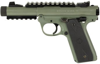 Ruger Mark IV Tactical 22/45 Polymer Frame Full Size 22LR 4.4″ Threaded Barrel, Elite Jungle Cerakote Finish, Checkered 1911 Style Grips, Adjustable Rear Sight, 10 Rounds, 2 Magazines