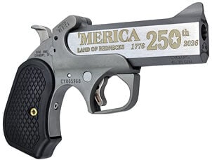 Bond Arms 250th Rough Series Derringer 45 Colt/410 Bore 2.5″ Chamber 4.25″ 250th Anniversary Engraved Flat Barrel, Stainless Steel, Silver, Black B6 Resin Grips, 2 Rounds, Trigger Guard