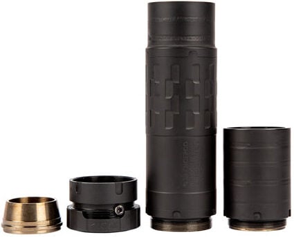 SilencerCo Omega 36M Suppressor, 5.56 to 338 LM & 9mm, Black Finish, 5.1″ -7.65″ Length, Effective for long-range precision shooting & hunting, Modular design: Can be used in long configuration or shortened by removing the front section, All of the mounting options: Can attach with ASR mount, Direct Thread Mount, 3-lug or Piston depending on the host firearm, Full-auto rated