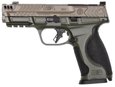 Smith & Wesson M&P M2.0 Metal Carry Comp Aluminum Framed Full Size 9MM, 4.25″ Ported Barrel, Flat Dark Earth Armornite Slide Finish & OD Green Frame, Front Night Sight, Blacked Out Rear Sight, No Manual Safety, Interchangeable Grip Inserts, Optic Ready, 17 Rounds, 4 Magazines