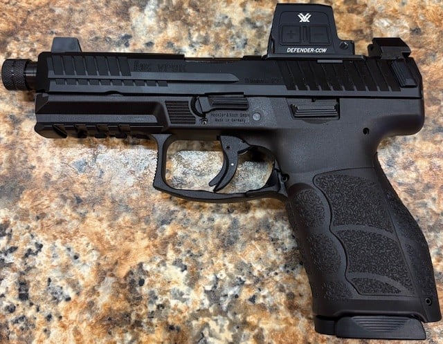 Heckler & Koch VP9A1 K Tactical Striker Fired Compact 9MM 4.7″ Threaded Barrel, M13.5X1 LH Thread Pitch, Matte Black Finish, Suppressor Height 3-Dot Sights, Tritium Front Sight, Factory Mounted Vortex Defender CCW, 15 Rounds, 2 Magazines