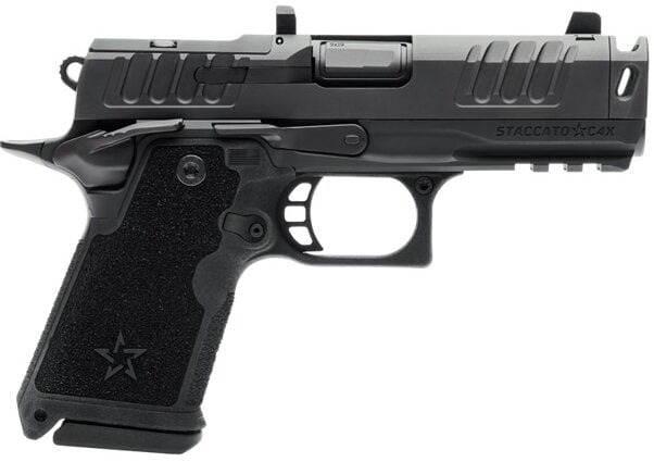 Staccato HD C4X 9mm 4″ DLC Comp Barrel, Standard Serrations, Curved Aluminum Trigger, Ameriglo Blacked Out Front & Rear Sight, Optics Ready & Includes (2) 15 Round Magazines