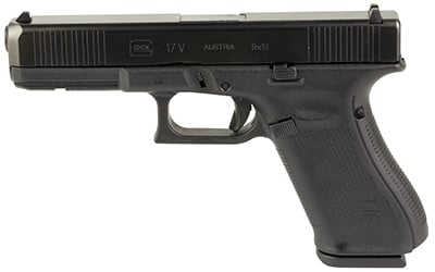 GLOCK, 17V, V Series, Striker Fired, Semi-automatic, Polymer Frame Pistol, Full Size, 9MM, 4.49″ Marksman Barrel, nDLC Finish, Fixed Sights, Ambidextrous Slide Stop Lever, Flared Mag Well, No Finger Grooves, Front Serrations 17 Rounds, 3 Magazines