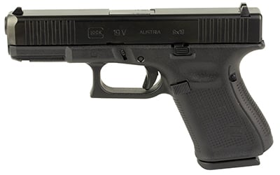 GLOCK, 19V, V Series, Striker Fired, Semi-automatic, Polymer Frame Pistol, Full Size, 9MM, 4.02″ Marksman Barrel, nDLC Finish, Fixed Sights, Ambidextrous Slide Stop Lever, Flared Mag Well, No Finger Grooves,Front Serrations 10 Rounds, 3 Magazines