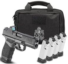 Springfield Hellcat Pro Gear Pac Striker Fired 9MM 3.7″ Hammer Forged Barrel, Black Melonite Finish, Textured Grip, Front White Dot Sight, Tactical Rack Rear Sight, Viridian Green Dot, 4 Magazines, (3)-17 Round and (1)-15 Round, Includes Range Bag