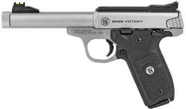 Smith & Wesson SW22 Victory Metal Frame 22LR 5.5″ Threaded Barrel, Stainless Steel, Polymer Grip, Fiber Optic Front Sight, Manual Thumb Safety, Adjustable Rear Sight, 10 Rounds, 2 Magazines