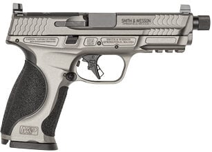Smith & Wesson M&P9 M2.0 Metal Striker Fired Aluminum Frame Full Size 9MM 4.625″ Barrel Stainless Steel w/Armornite Finish, 1/2 x 28 Threaded Barrel, Tungsten Gray Cerakote Finish, Optic Height Sights, No Manual Safety, Interchangeable Grip Inserts, Optics Ready, 17 Rounds, 2 Magazines