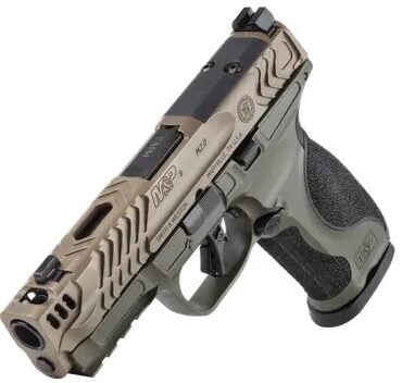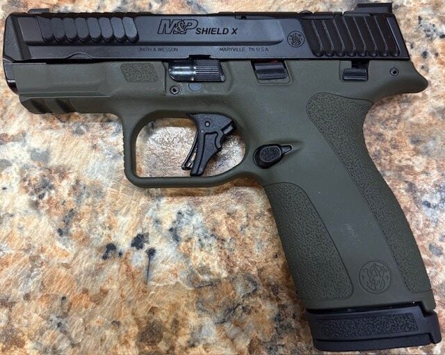 Smith & Wesson M&P Shield X Striker Fired Compact 9MM, 3.6″ Barrel, Black Armornite Finish Slide & OD Green Frame, Manuel Thumb Safety, Optic Ready, Front Night Sight, 2 Magazines, (1)-13 Round, (1)-15 Round