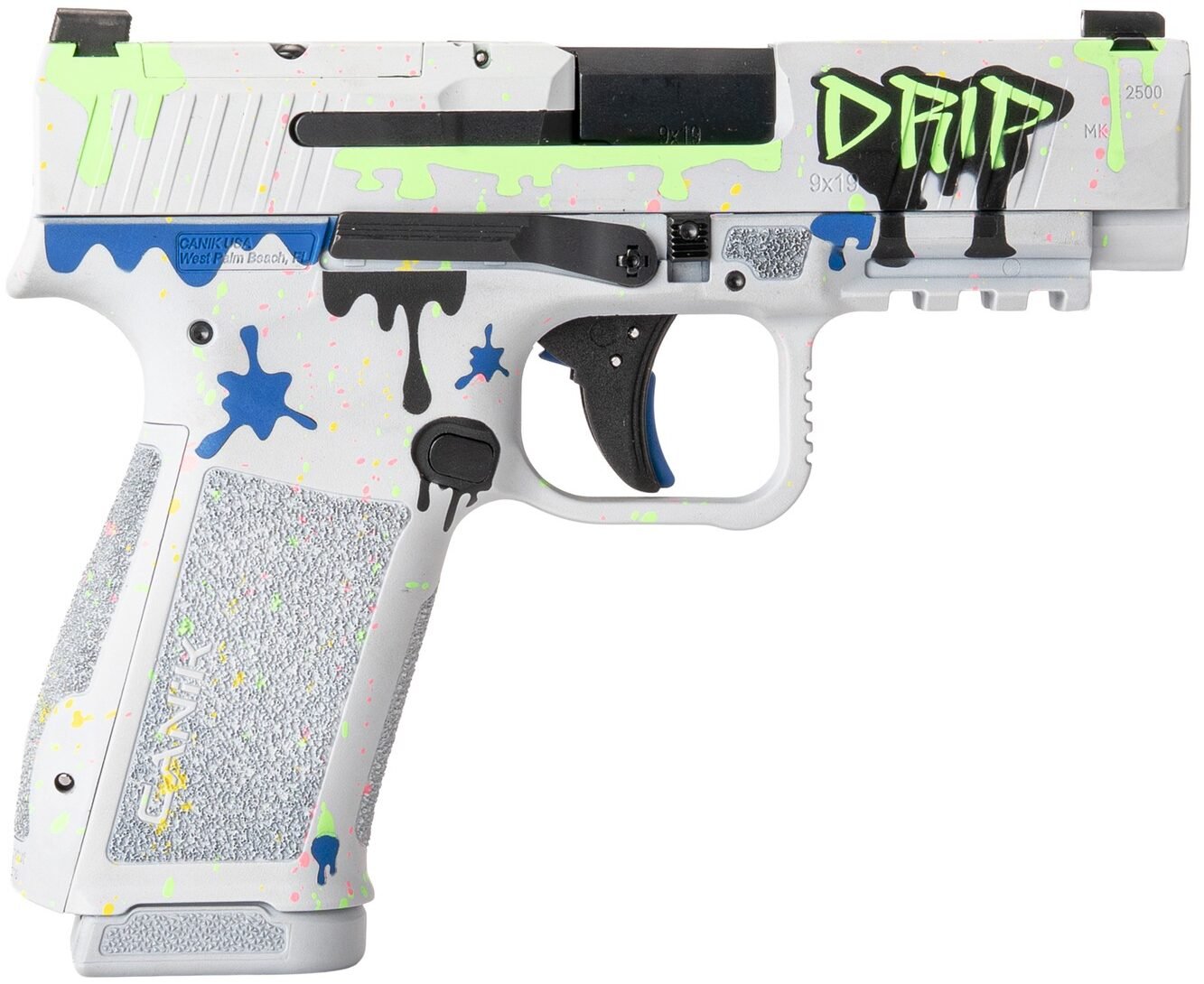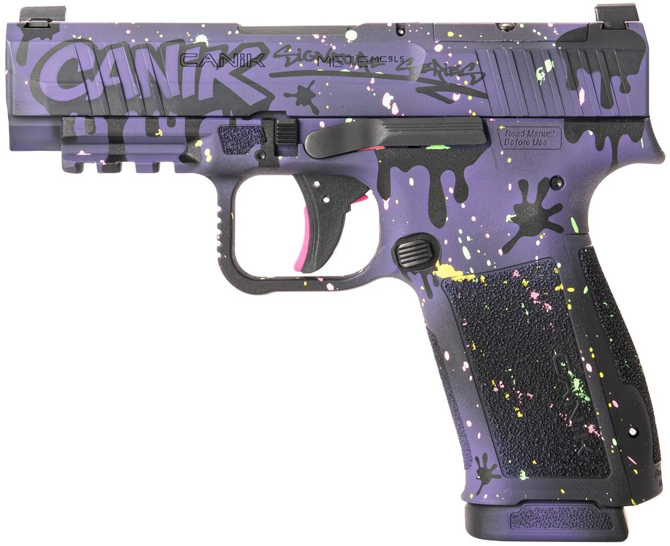 The CANIK METE MC9LS Signature delivers compact 9mm performance with standout style. Featuring a 3.64″ barrel and an eye-catching white Drip Cerakote finish, this striker-fired pistol blends everyday carry practicality with a bold custom look. Its optic-ready slide makes it easy to add a red dot, while the white dot front sight and blacked-out rear sight provide a clean, fast sight picture. With a compact polymer frame, two included magazines, and a 17-round capacity, the MC9LS Signature is built for shooters who want reliability, capacity, and distinctive style in one package.